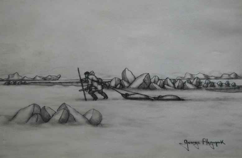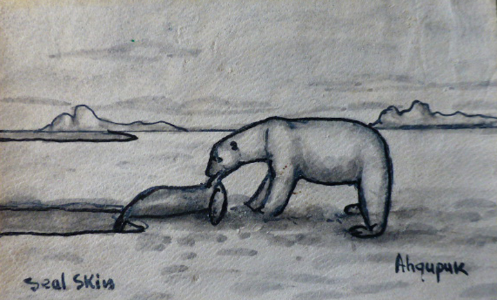 Ahgupuk pen and ink of Eskimo dragging hunted seal