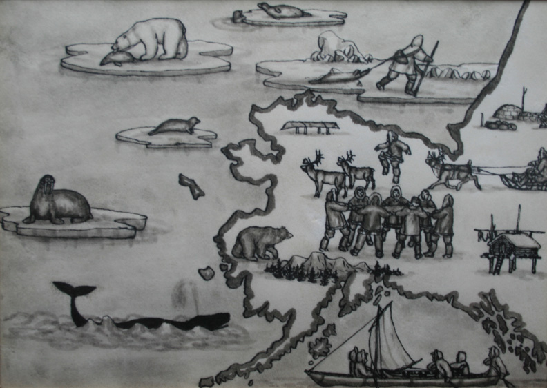 Ahgupuk pen and ink of Caribou on the Arctic tundra and Eskimo Hunters in the Arctic