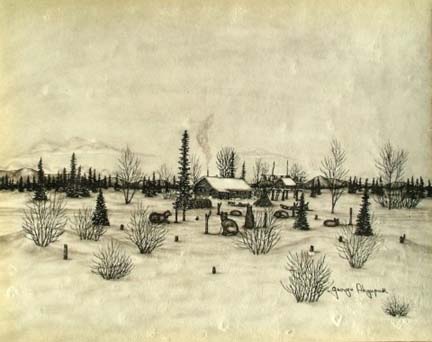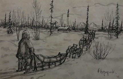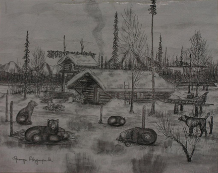 Ahgupuk original pen and ink of Alaskan cabin scene, sled dogs & Eskimo woman and baby