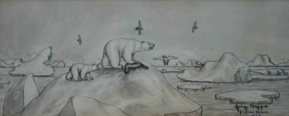 Ahgupuk original two polar bears in the Arctic, signed Eskimo Artist 1950