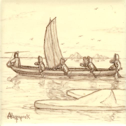 Ahgupuk originals on ceramic tiles of Sled dog scene, Arctic polar bear and Umiak scene