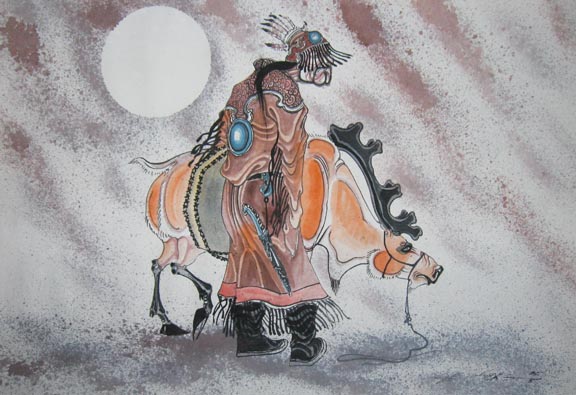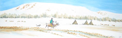 Unsigned Alaskan artwork - mounting a reindeer, riding a reindeer,walking next to a reindeer