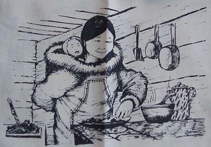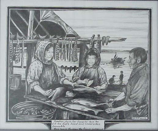 Patrick Minock silk scarf with Eskimo woman sewing Mukluks, drying salmon, fishing Tomcod and making dinner