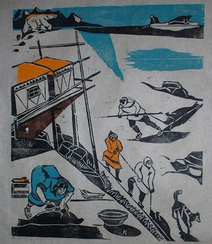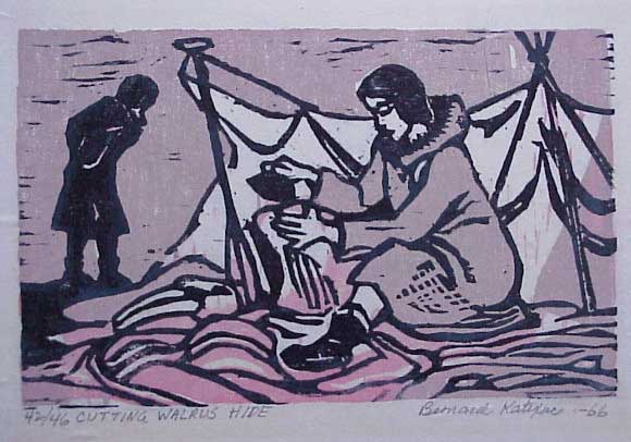 Katexac print titled “Cutting walrus hide”, print # 42/46, 66, meaning 1966