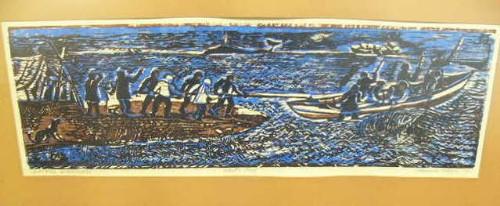 Katexac print titled “Launching Whaleboats”, print artist proof, 70, meaning 1970