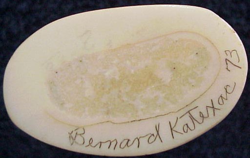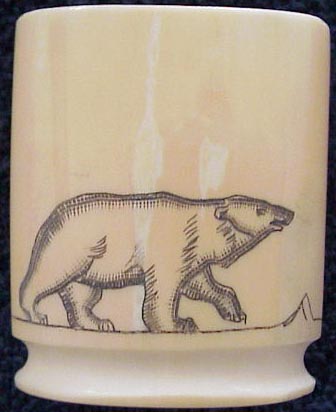 signed Bernard Katexac on bottom of ivory scrimshaw cup with a polar bear and reindeer, 73, meaning 1973