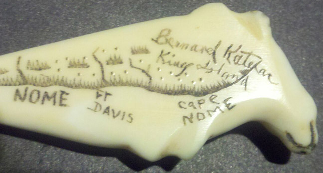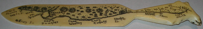 Katexac ivory letter opener map highlighting King Island, Cape Douglas, Cape Wooley, Cape Rodney, Sledge Island, Nome, Fort Davis, Cape Nome