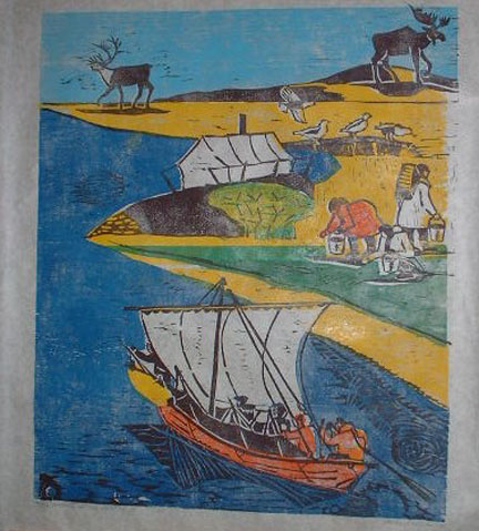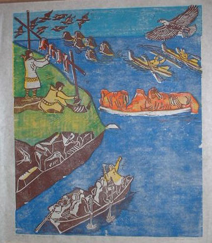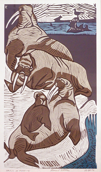 Bernard has chosen to show a walrus family resting on an ice flow during one of the migration periods. The print is made with the understanding and respect of a man who knows his own well-being is linked to the welfare of the animal he hunts. It is an affirmation of life which renews itself even in the icy Arctic waters