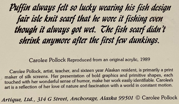 “Puffin always felt so lucky wearing his fish designed fair isle knit scarf that he wore it fishing even thought it alway got wet. The fish scarf didn’t shrink anymore after the first few dunkings.