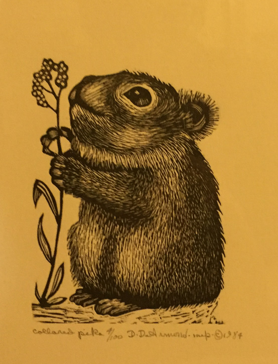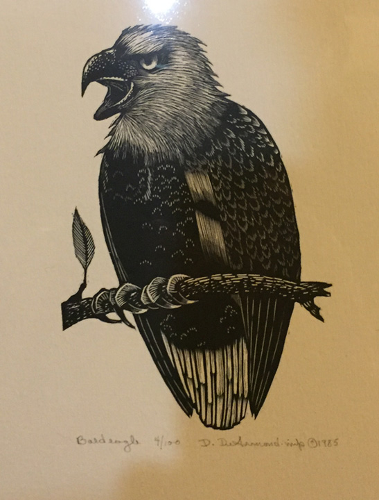 Row 3 : “DeArmond prints titled – “Wooly Mammoth”, “Collared Pika”, “Bald Eagle” and “Arctic Loon”