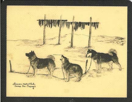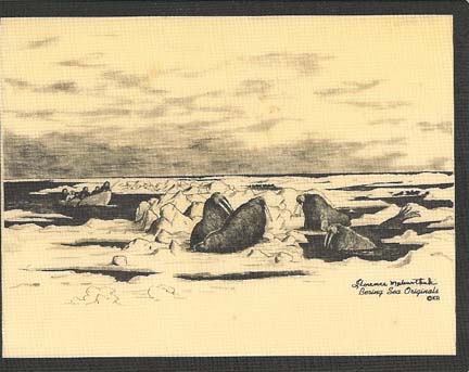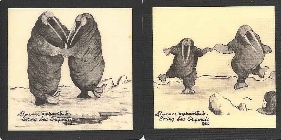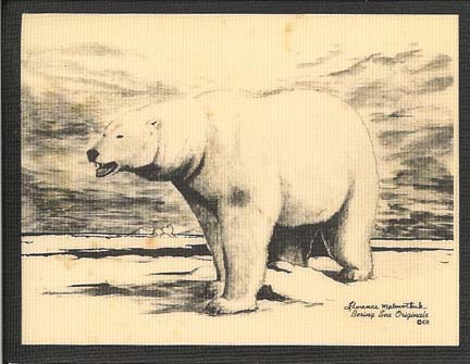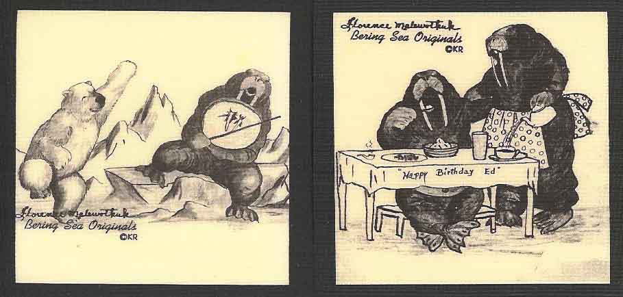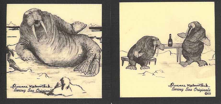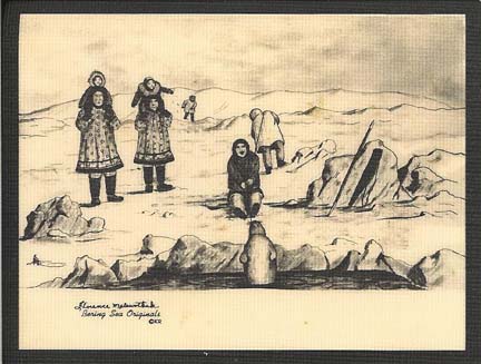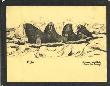 Additionally, Alaska Northwest Publishing Company had prints of Eskimo hunter, splitting walrus hide, skinning seal and Eskimo seal hunter. The original pieces were destroyed in a fire and the prinss are sepia-tone on embossed ivory colored stock.