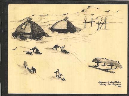 Nupok Malewotkuk reproductions by Bering Sea Originals – black frame border for cup and dining mats of various alaskan scenes