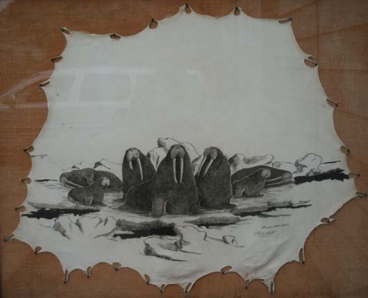 Nupok Malewotkuk original pen and ink of walruses in the Arctic on a stretched seal seal hide