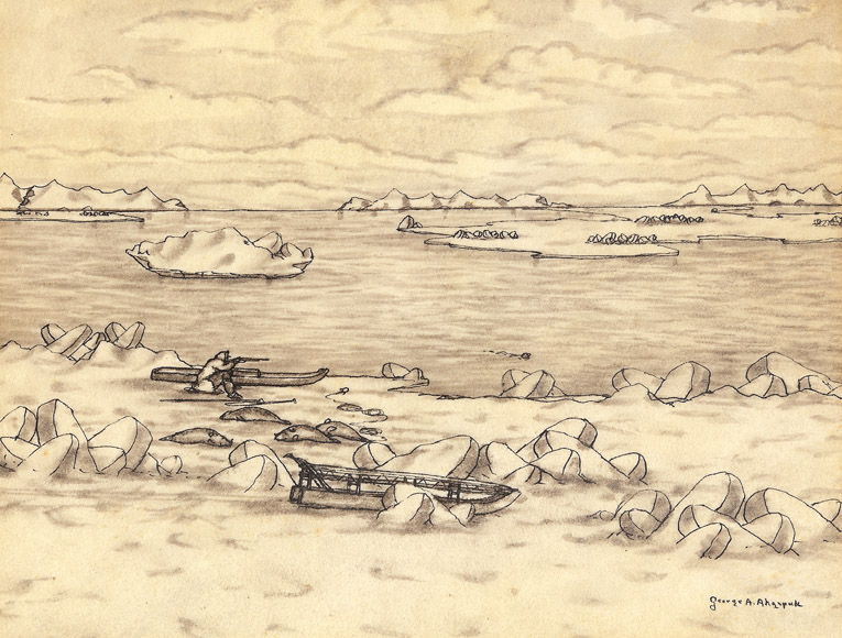 Ahgupuk original pen and ink Inupiat hunting seal in Arctic open water