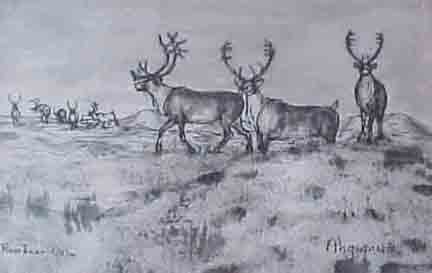 Ahgupuk pen and ink of caribou on the arctic tundra and Eskimo hunters in Arctic paradise