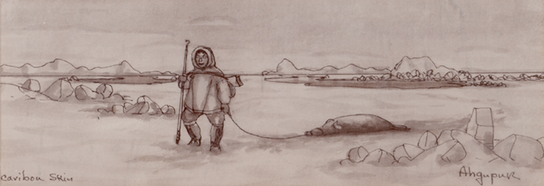 Ahgupuk original pen and ink of Eskimo dragging hunted seal