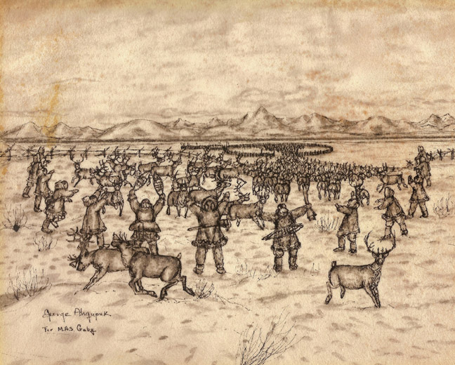 Ahgupuk originals – reindeer grazing in Alaska & Eskimo hunter dragging a seal