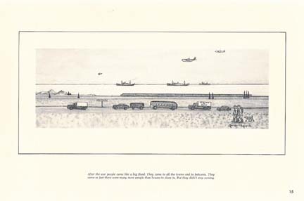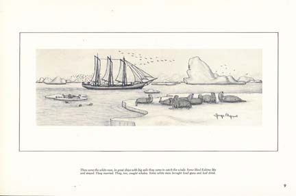 Rockwell Kent, the famous artist, visited Alaska in the late 30’s and was enthusiastic over Ahgupuk’s picture drawings. On his return to the States he told of the artist’s genius in the New York Times and in Time Magazine. The American Artists Group invited him into membership, and two of his pictures were hung in the Weyle Gallery in New York. Overnight, this heretofore unknown Eskimo youth became a renowned artist.
