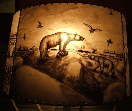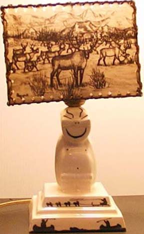 hand-made, original ceramic base. shade is four actual, washable photographs, 5×7 oil tinted transparencies that will not fade. large selection of photographs of alaska scene and animals. height of lamp is approxiately 13 inches. only $17.50 postpaid”