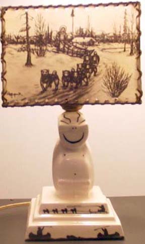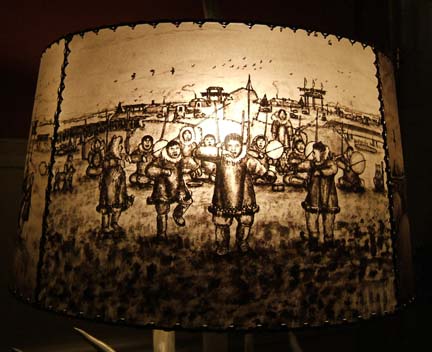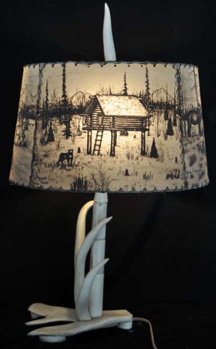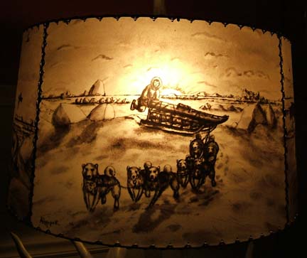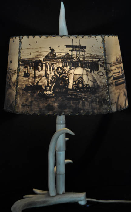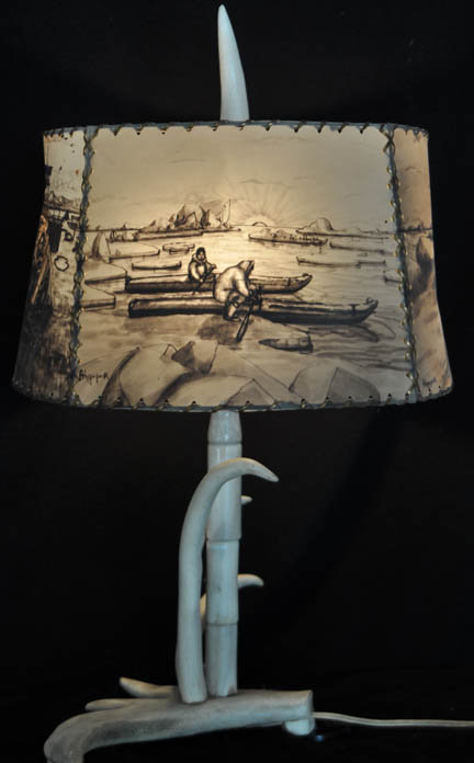 Ahgupuk lamp shade with polar bear, sled dog team, blanket toss and Eskimo dancers with antler base and finial