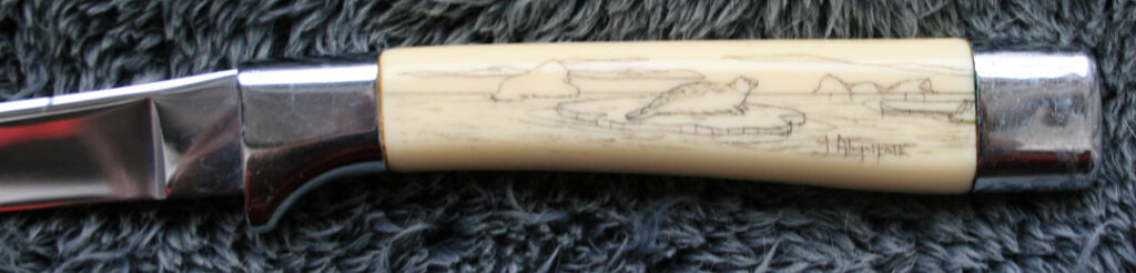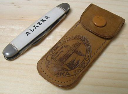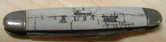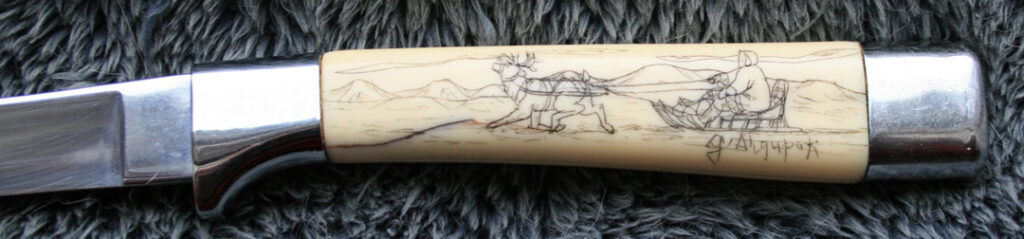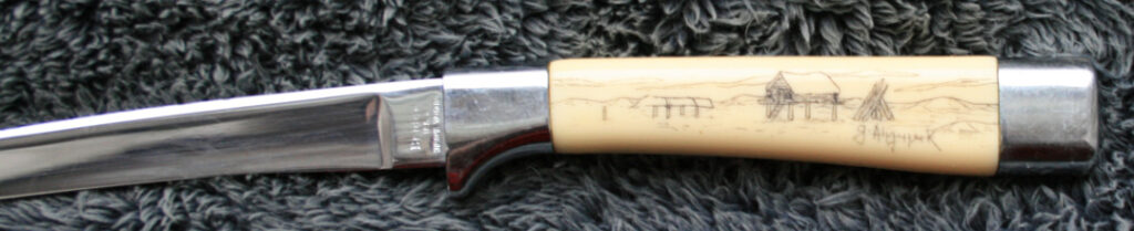 pen knife with leather sleeve with Ahgupuk art