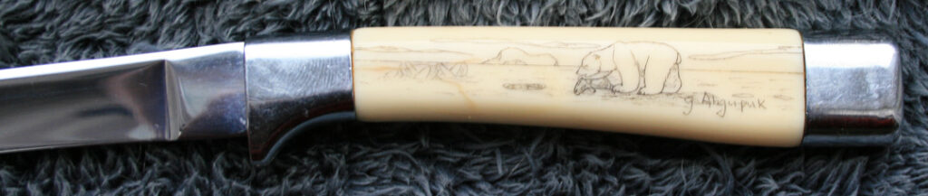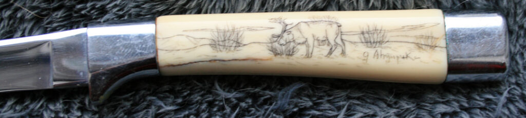 Carvel Hall steak knives by Briddell with Ahgupuk scrimshaw
