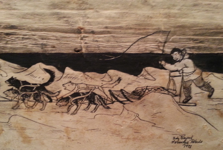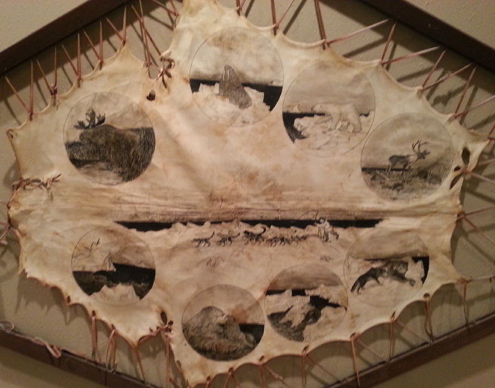 Judy Pelowook pen and ink on stretched skin featuring Alaskan scenery