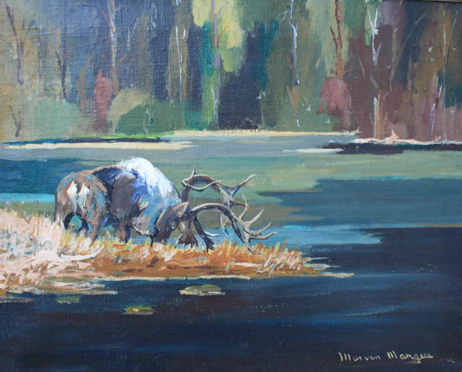 Marvin Mangus original painting of caribou drinking at lake’s edge