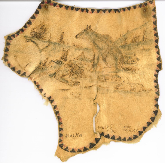 “No-9k Wolf. This is a scene of old reindeer coral and a cabin still in use – wolf have just killed a reindeer calf near the coral” – by M. Minock address – Pilot Station, Alaska Lower Yukon.