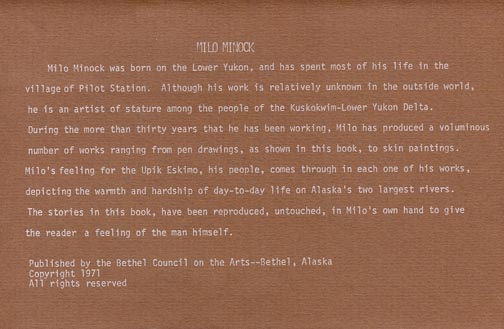 Milo Minock was born on the Lower Yukon, and has spent most of his life in the Village of Pilot Station. Although his work is relatively unknown in the outside world, he is an artist of stature among the people of the Kuskokwim-Lower Yukon Delta. During the more than thirty years that he has been working, Milo has produced a voluminous number of works ranging from pen drawings, as shown in this book, to skin paintings. Milo’s feeling for the Yupik Eskimo, his people, come through in each one of his works, depicting the warmth and hardship of day-to-day life on Alaska’s two largest rivers. The stories in this book, have been reproduced, untouched, in Milo’s own hand to give the reader a feeling of the man himself.