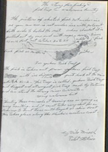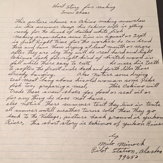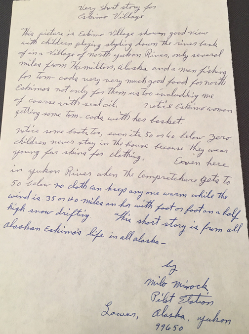 “This picture is eskimo village shown good view with children playing sliding down the river bank of in a village of north Yukon River, only several miles from Hamilton, Alaska and a man fishing for tom-cods very very much good for for north Eskimos not only for them us including me of course with seal oil. Notice Eskimo women getting some tom-cods with her basket. Notice some boats too, events 50 or 60 below zero children never stay in house because they wear young fur skins for clothing. Even here in Yukon River when the temperature gets to 50 below no cloth can keep anyone warm while the wind is 35 miles an hour with foot or foot an a half high snow drifting. This short story is from all Alaskan Eskimos life in fall Alaska. By Milo Minock Pilot Station, Lower, Alaska, Yukon 99650”