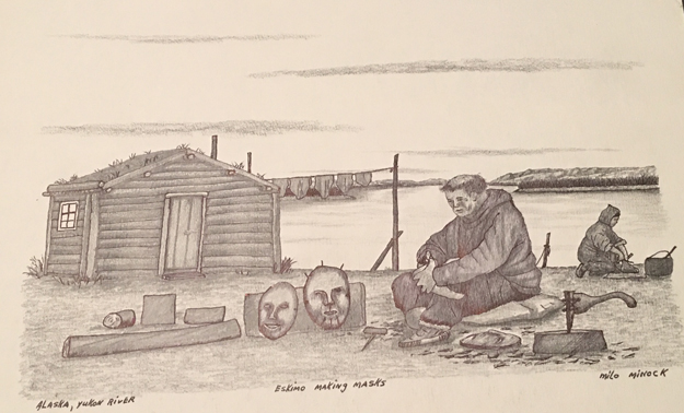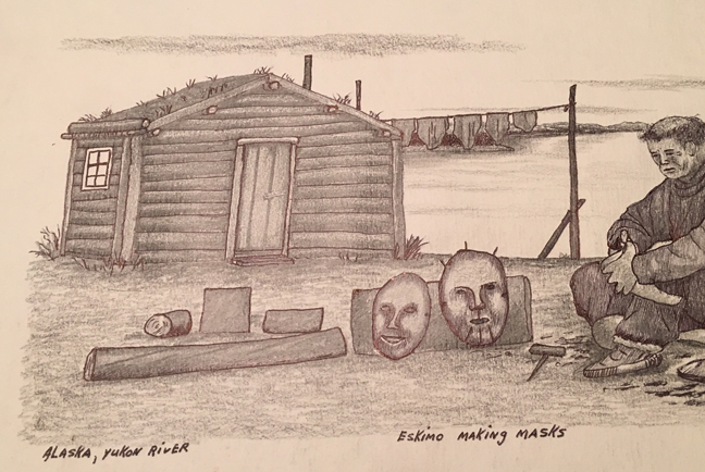 “This is picture of eskimo making dance wooden masks out of wood stumps, for use at eskimo pot-latch dance, one nearest to man is called old women of the north when they are finished some of them will be painted with clay or regular paint some masks like these imitate animals different kind of animals and all have different and of meaning. And during this kid of Eskimo dance, called Pot-Latch dance everyone is invited even the whole village is invited children and everyone, food for all is always ready most eskimos or natives of yukon have houses like this in the picture it is like my house too, but right now most Eskimo have Alaska housing all over with oil and wood stoves. Also notice Eskimo women is preparing to cook caribou meat by open fire this is Alaska Eskimos old way of life from Alaska. By Milo Minock Pilot Station, Alaska 99650”