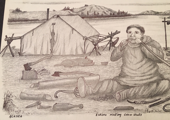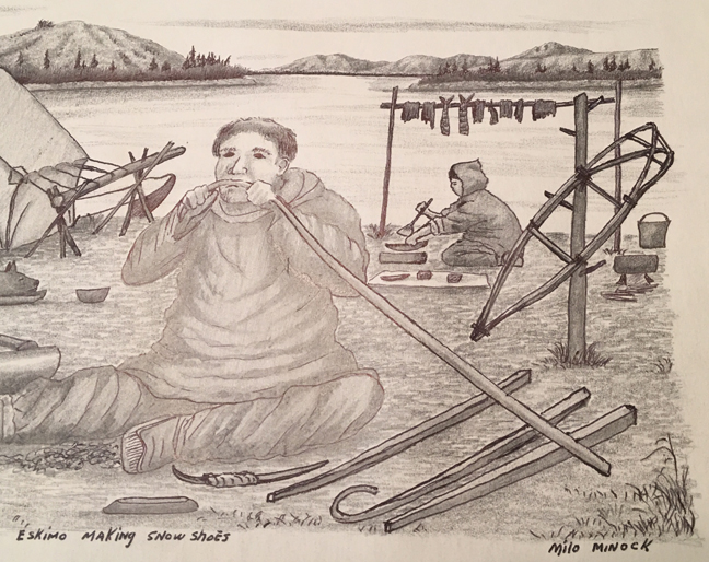 “This picture shows an Eskimo making snowshoes in his summer camp his Eskimo wife is getting ready for lunch of boiled white fish. Making snowshoes some time in August or Sept. is just right time for the worker he can bend them and have them drying at least month or more after they are dry they will be real hard and light Eskimos look for right kind of birch wood in the fall while there easy to cut. He uses his teeth to soften the front ends back and forth like those already hanging. Also notice some drying seal meat hang above his old women some pike fish too. Preparing a meal, this Eskimo will trade these snowshoes for food or seal oil or anything he does not have. Also notice there summer tent they live in tents all summer until weather turns cold then they go back to the village, picture back ground is Yukon River. This short story is Eskimo of Yukon River. By Milo Minock Pilot Station, Alaska 99650”