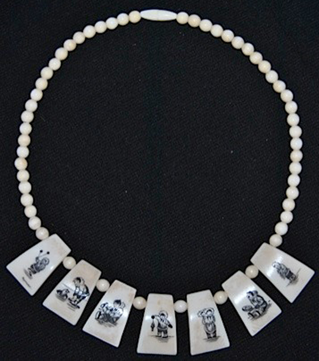 Nunguruk ivory scrimshaw ivory cribbage board and unknown artist/designer ivory cutlery