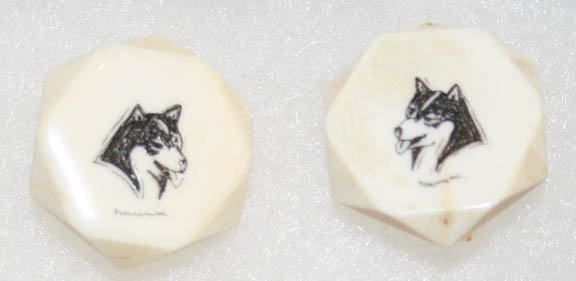 Nuguruk Eskimo seal hunt scrimshaw ivory pin and Nuguruk husky scrimshaw ivory earrings.