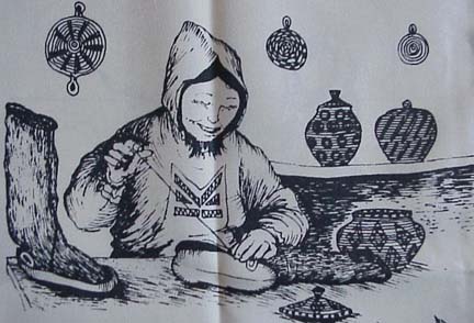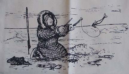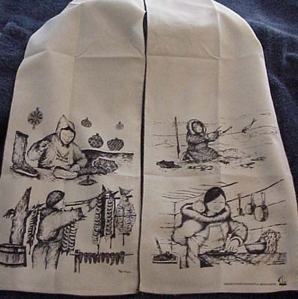Patrick Minock silk scarf with Eskimo woman sewing mukluks, drying salmon, fishing tomcod and making dinner
