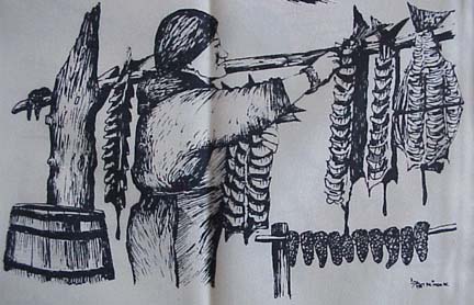 Patrick Minock original drawing of mother and daughter cleaning fish