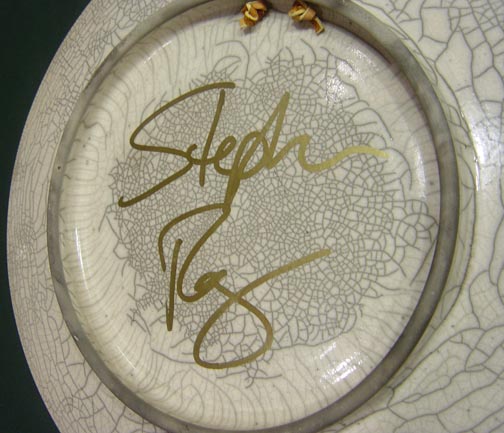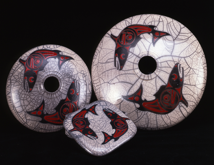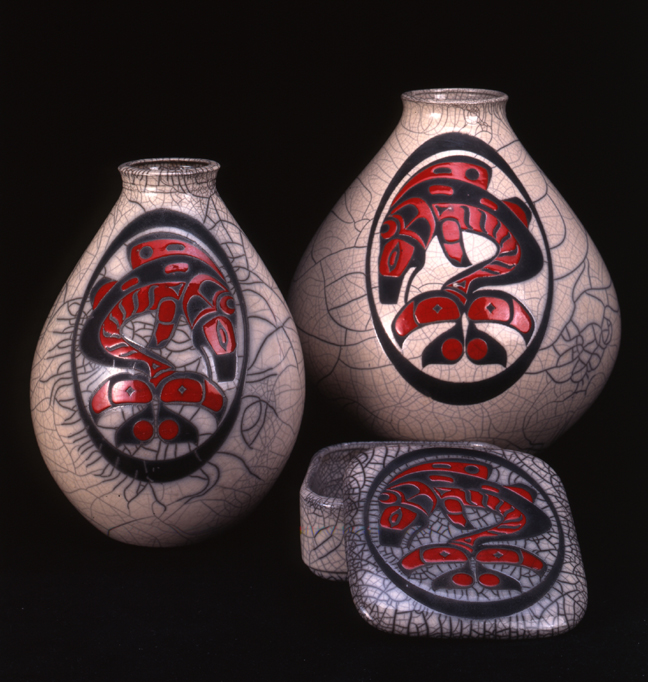 Roy ceramic of raven, his signature and salmon