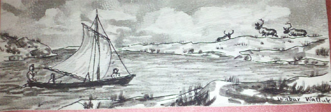 Wilbur Walluk pen and ink drawings Eskimos in umiak sailing toward caribou and bull & female moose walking in the forest
