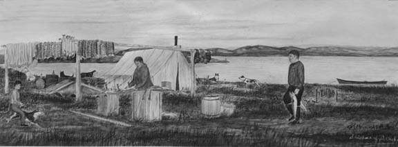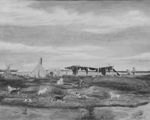Wilbur Walluk original drawing featuring an Eskimo kayaking with camp scene