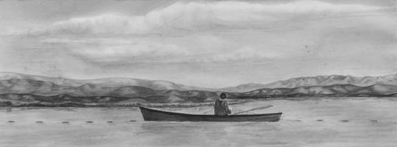 3 Walluk originals – Eskimo family cleaning fish and man in kayak paddling in open waters