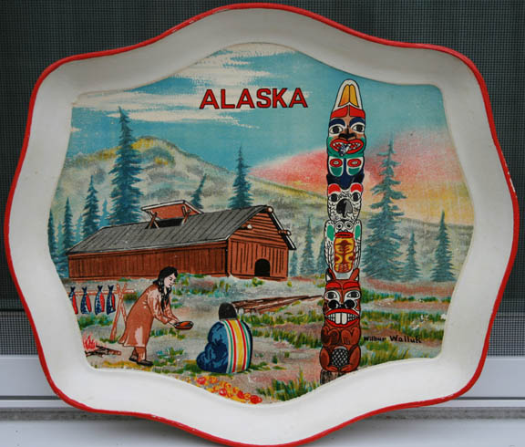 Wilbur Walluk commercially made serving tray of totem and lodge with “Alaska”