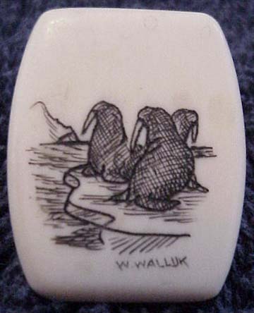 Wilbur Walluk scrimshaw of walruses on a ice floe